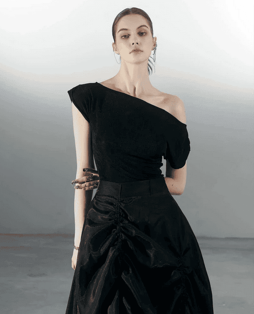 Chiếc áo lệch vai cùng chiếc váy có các đường nhún cầu kỳ tạo nên vẻ thời trang ấn tượng, khác biệt.